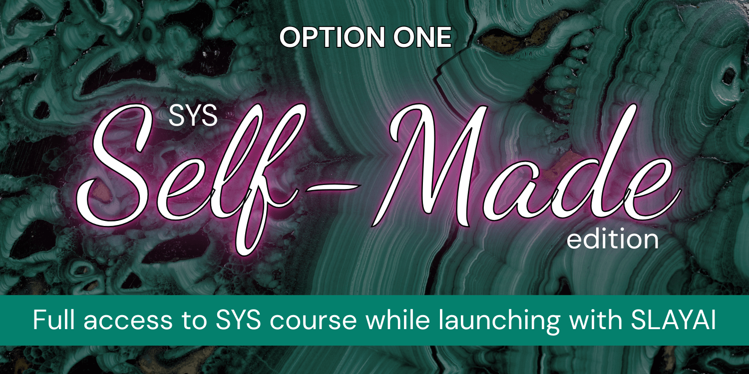 The Self-Made Edition is your lane. You get full access to the Slay Your Sales curriculum and my custom-trained AI strategist. My brain to answer your questions; Giving you guidance, precision, and support every single step of the way. It’s a refined, self-led experience built for women who don’t need someone to run the launch for them, but direction to execute like a pro.